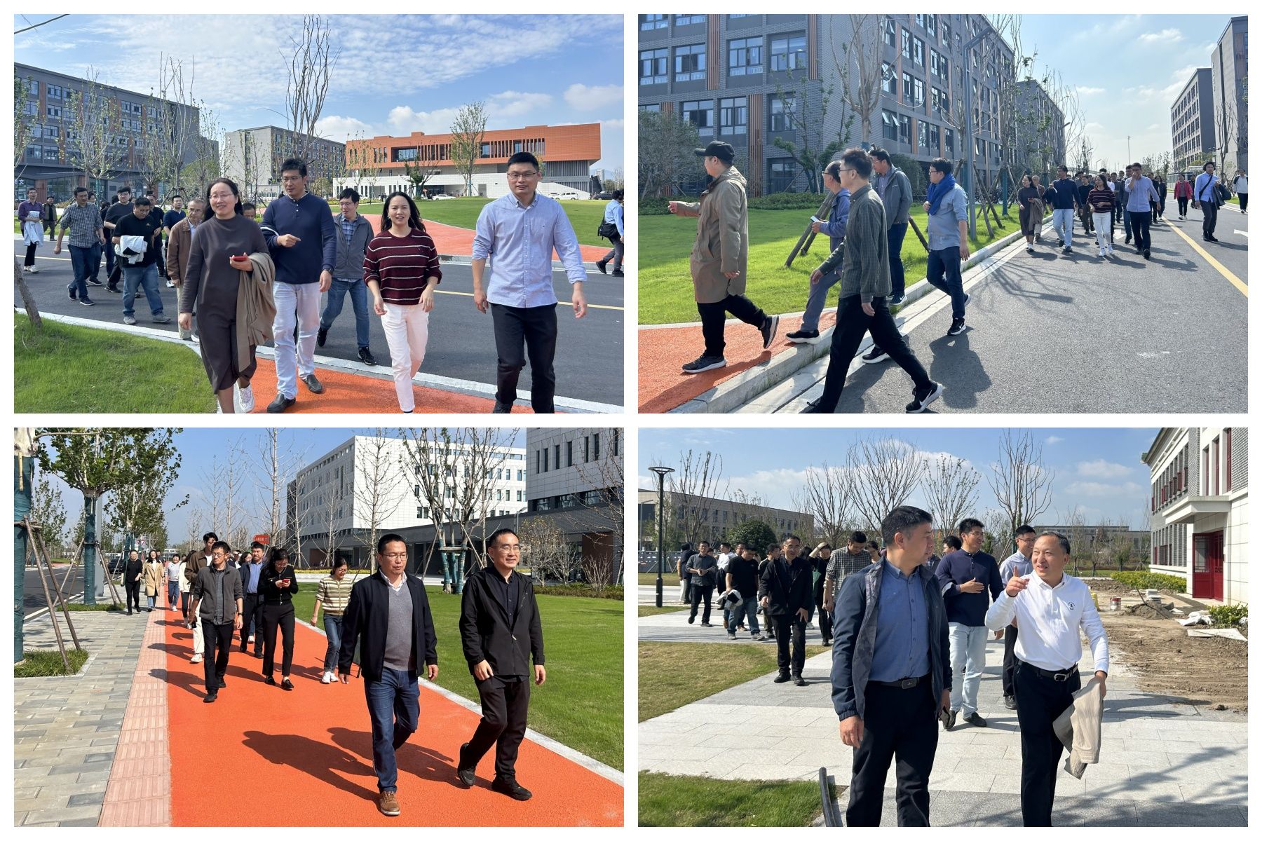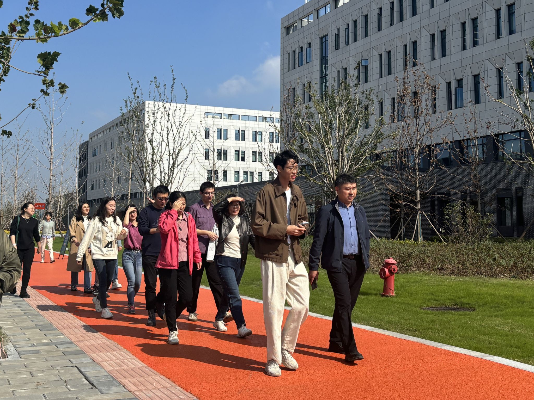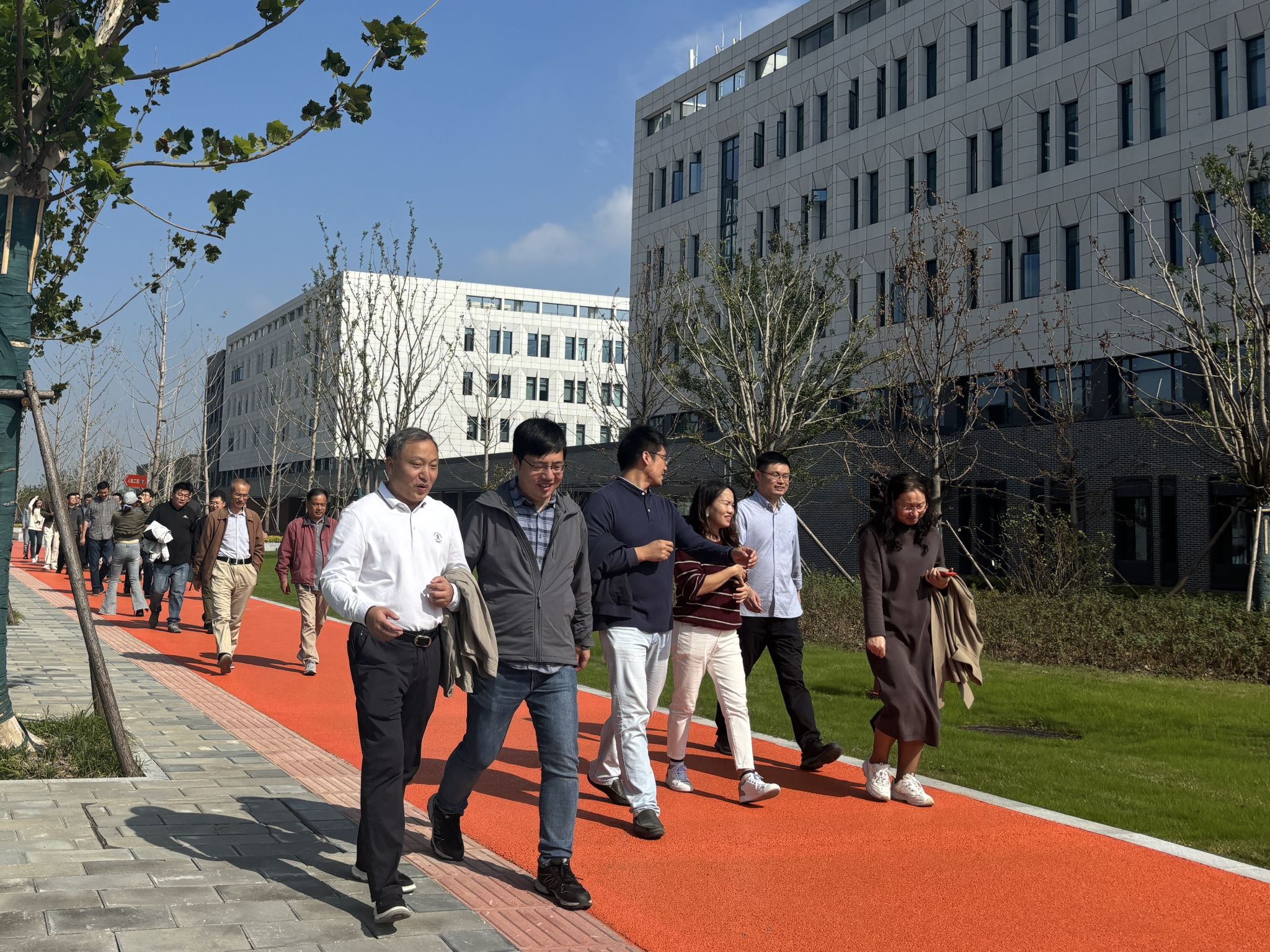 全体教师合影留念后,学院党委书记许承保、院长张正光带队从17号楼出发。老师们精神抖擞、兴致昂扬,三五成群交流着近期的工作与生活,并不时驻足欣赏滨江校区的美景美色。