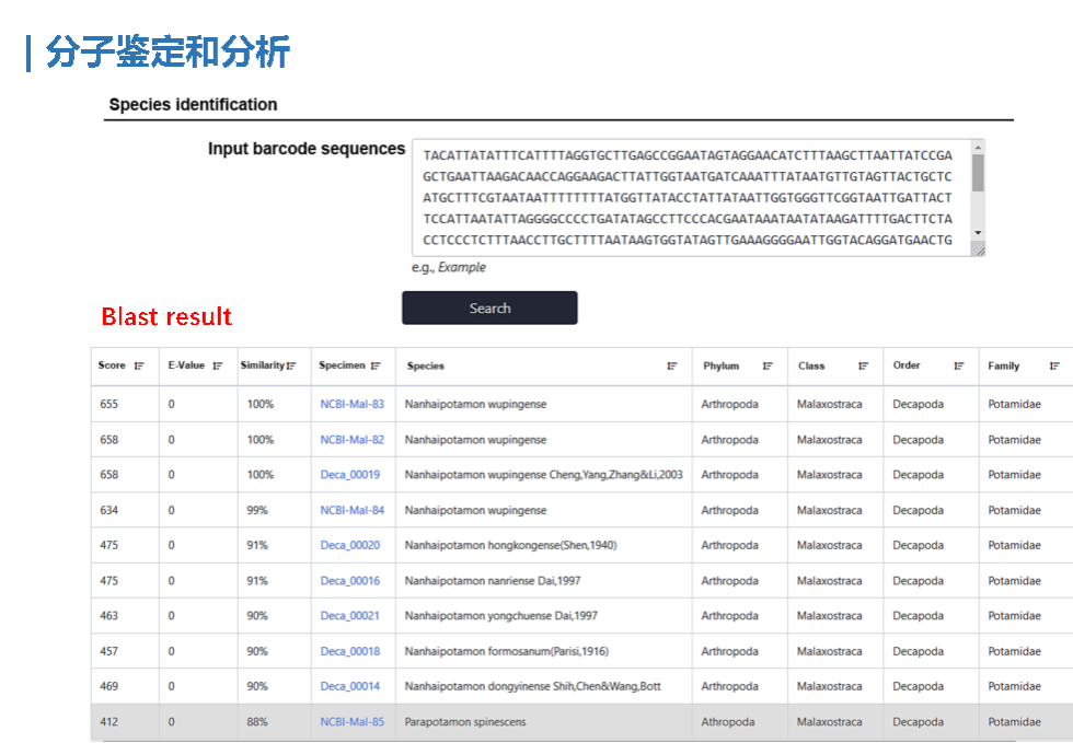 数据库为单个物种条形码信息比对和分析提供了平台,在搜索框中输入fasta格式文件或者需要查询的序列,经过BLAST比对,得到按相似度排列的分子鉴定结果。分子鉴定不仅可以在该数据库内进行比对鉴定,也可以跨平台选择下载至本底的GenBank、BOLD等公共数据库同时进行分子鉴定。数据库配备的小工具:Muscle、GeneWise、LASTZ、Compare等可辅助使用者进一步进行生信分析。