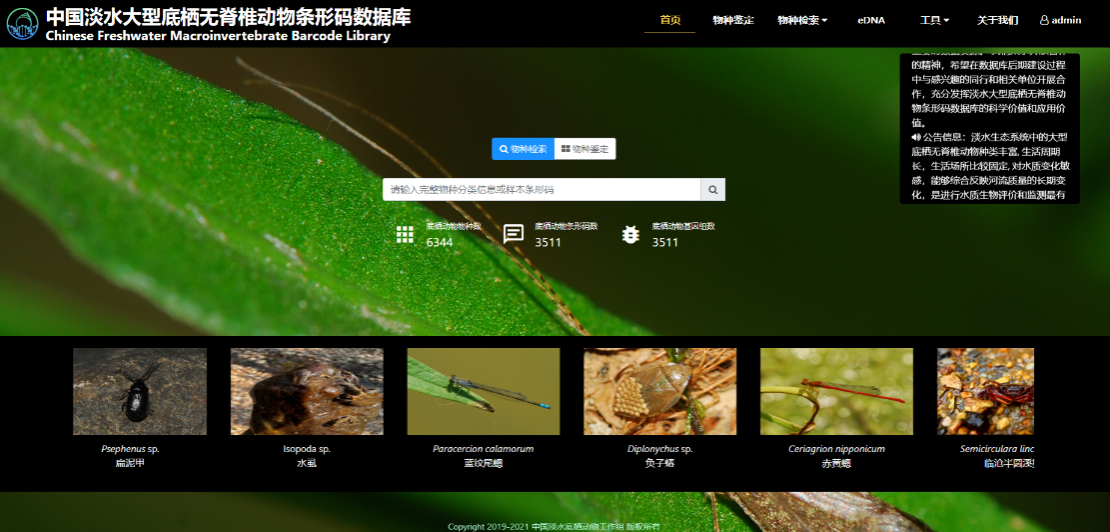 携手国内15个高校和科研院所研发的中国淡水大型底栖无脊椎动物条形码数据库,经过多年的数据积累、数据库功能开发和网络开放使用功能研发与优化后正式对外开放//cfmlib.av-md.net/(数据库注册使用等事宜,请联系[email protected])。