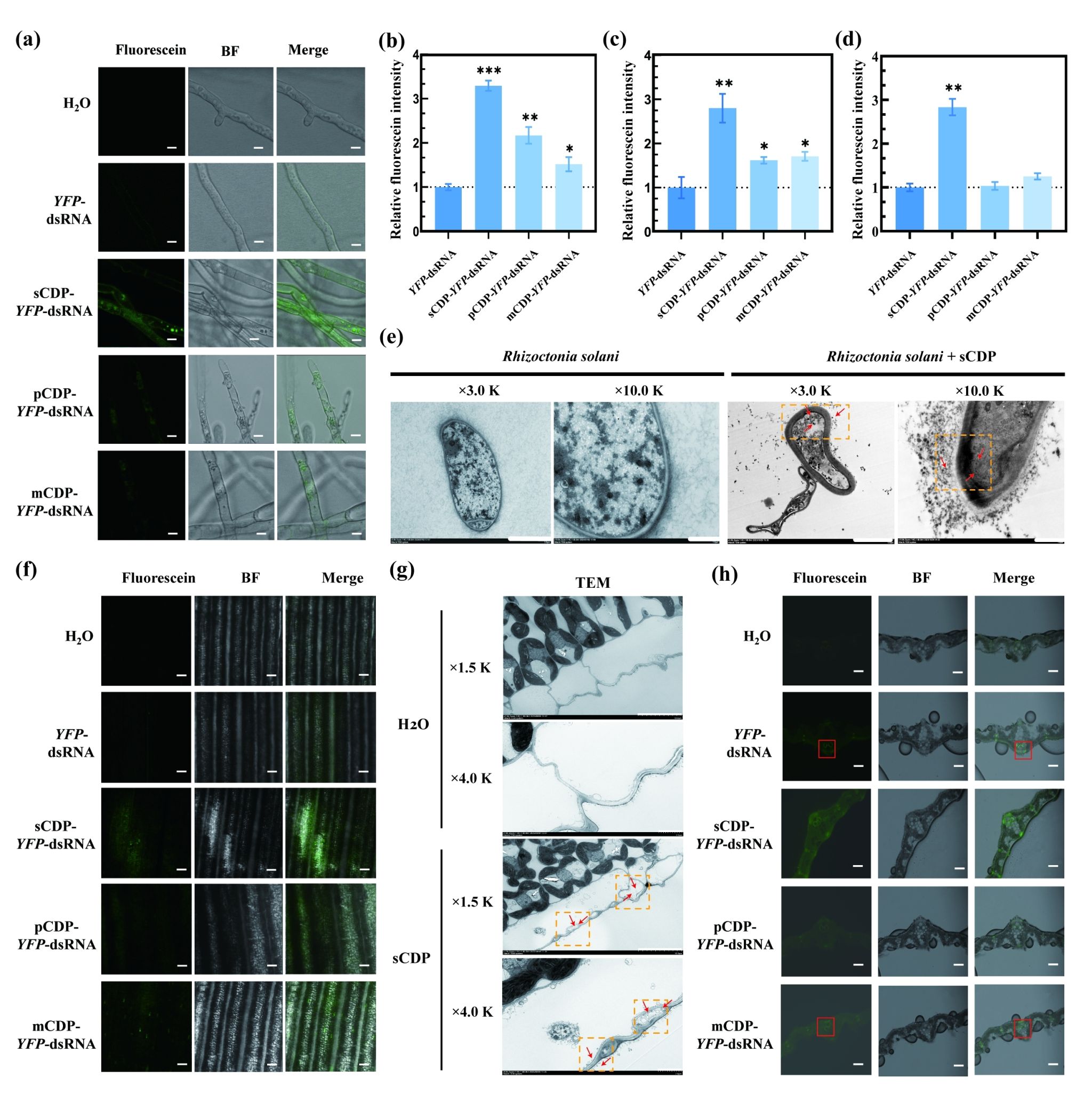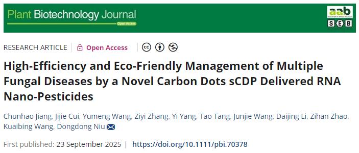 生物农药及绿色植保实验室牛冬冬教授组撰写的题为“High-efficiency and Eco-friendly management of multiple fungal diseases by a novel carbon dots sCDP delivered RNA Nano-pesticides”研究论文,创新提出利用聚乙烯亚胺PEI修饰后的碳量子点sCDP纳米递送系统,增强dsRNA的稳定性,提高对dsRNA吸收效率,增强纳米 RNA农药的作用效果,延长持效期,有效解决RNA农药防效不稳定、持效期短等瓶颈问题。此外,该纳米递送系统对黑曲霉、灰葡萄孢、稻瘟病菌、大豆锈菌四种主要病原菌均表现出广谱的抗真菌活性,相关研究为RNA农药的产业化应用推广提供了新思路。