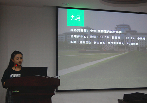 会上,学生会主席团成员依次介绍了各部门职能及近期工作安排。副主席王钲霖指出,理科楼D103房间是我院学生会、中华虎凤蝶保护协会、植物保护协会的共用活动场地物品繁多,空间有限,需要大家共同爱护科协主席荆诗韵讲到,学生会将面向全体成员进行常用办公软件、宣传策划、基本礼仪等系列培训,以促进学生会工作高效开展副主席李同鑫向大家传达了2018级迎新晚会的任务安排,此次晚会将打破以往按部门分工的方式,改为按职能招募宣传组、演员组、场控组、文职组、舞美组、机动组等六个小组的志愿者,充分融合学生会以及调动新生的积极性;团委副书记吴贺为大家介绍本学期的素质拓展和志愿服务活动,包括定向越野、明城墙调研活动、紫金山登道活动、天文台讲解等,引导大家服务社会;最后,学生会主席欧阳雪传达了各部门在接下来九十月的大事安排,希望各部门既能分工明确,又能协同合作,共同打造强大而温暖的“植保一家”