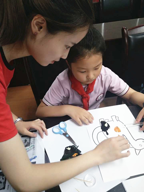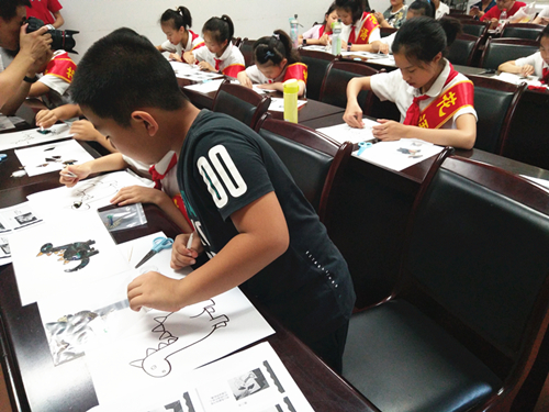 一幅蝶翅画,拼贴出奇妙想象。在展示精美的蝶翅画作品后,小朋友们都跃跃欲试。在负责蝶翅画教学的队员们带领下,孩子们挥洒着大胆新奇的想象力,用各式各样的蝴蝶翅膀进行着创作,不一会儿的工夫,课堂上就出现了一只只五彩斑斓、栩栩如生的恐龙……