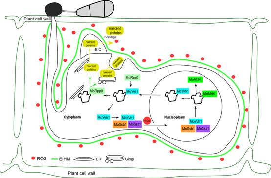 稻瘟病菌在侵染水稻早期时,水稻会产生大量活性氧激发免疫反应,抑制病原菌的侵染,而病菌可分泌大量效应蛋白到水稻中干扰其免疫反应。该团队前期的研究中鉴定到蛋白磷酸酶MoYvh1控制病菌致病力(MPMI,2016)。在最近发表的论文中发现,病菌监控水稻产生的活性氧信号,利用两个热激蛋白MoSsb1、MoSsz1“挟持”MoYvh1进入细胞核,在细胞核内MoYvh1挤占核糖体蛋白MoMrt4位置,加速核糖体的成熟,促进病菌合成更多效应蛋白去干扰水稻的免疫反应,从而成功侵染水稻。该研究解析了稻瘟病菌监控水稻免疫反应,启动攻击系统,加速自身核糖体的成熟,以合成的效应蛋白为“武器”,进而干扰寄主免疫系统的机制。该研究拓展了人们对植物病原真菌监控寄主免疫反应的认识,有助于认识病原菌的致病机理,同时可望为设计高效、低毒的稻瘟病控制策略提供参考。该项目得到了国家自然科学基金重点项目和国家杰出青年科学基金的资助。