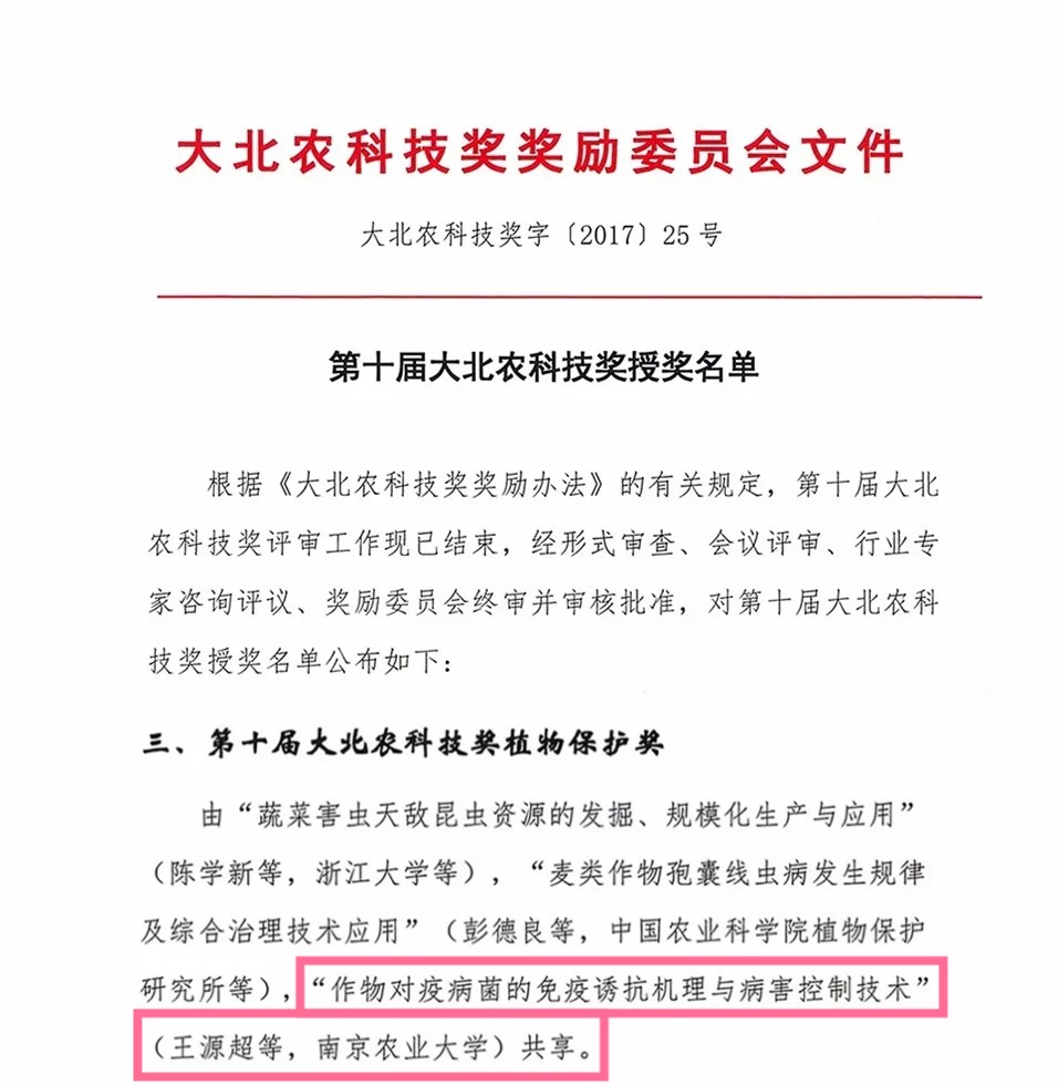 12月26日,由大北农科技集团出资设立的“大北农科技奖”评审结果揭晓,由我院王源超教授主持完成的“作物对疫病菌的免疫诱抗机理与病害控制技术”项目荣获第十届大北农科技奖植物保护奖。