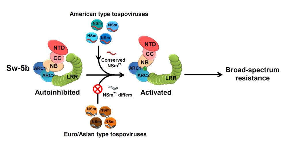 virus, TSWV) 可侵染1000多种植物,每年在全球范围内造成数十亿美元的经济损失,被列为全球为害最严重的植物病毒之一。在我国发生的番茄斑萎病毒属病毒包括美洲型和欧亚型两大类,其中流行最为广泛的TSWV则属于美洲型病毒。该研究发现来自番茄的免疫受体蛋白Sw-5b可通过识别美洲型番茄斑萎病毒编码的移动蛋白NSm中的一段高度保守的由21个氨基酸组成的肽段(NSm21)从而实现其对该类病毒的广谱抗性。进一步研究发现Sw-5b是通过与NSm21发生直接互作来诱导植物的防御反应的。该研究还鉴定了Sw-5b识别NSm21的关键位点,并进一步揭示了受体蛋白从识别到抗性激活的转换分子机制。另外,对南美野生番茄Sw-5的进化研究发现该免疫受体蛋白对病毒的识别位点是在长期的正向选择作用下进化而来的。