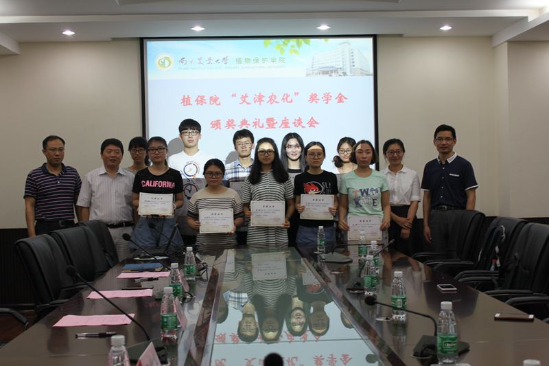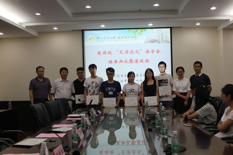 在热烈的掌声中,主持人黄绍华依次介绍与会的领导嘉宾。紧接着由吴益东教授宣读此次获奖名单,栾静、裘雯婷、高雅等10名本科生以及魏琪、李莹等6名研究生获奖。激动人心的颁奖典礼过后,为让大家更好地了解艾津农化,屈继辉先生向同学们详细介绍自己公司的基本情况。在提到与植保院的合作时,他表示十分希望看到植保院的同学前来实习。最后还和现场获奖学生及学生代表进行交流互动,解答学生们有关就业方面的问题。