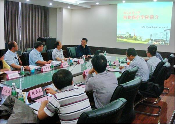 交流考察表示欢迎,介绍了我院的基本发展情况,特别是在学科建设、科研团队、人才培养等方面。随后,双方在学科管理、科研团队建设、人才培养和输送、高层次人才引进等方面展开了热烈的讨论。西北农林科技大学刘同先介绍了人才培养与引进情况以及教学科研平台建设,表达了在学科和团队建设方面与我院合作的意向,共同探讨“校院二级管理”的相关经验。王源超指出要通过国际化促进专业建设水平的提升加强学科建设,实现以国际化的科学研究带动本专业建设的国际化,加快与国际接轨进一步扩大国际影响力。吴益东强调要用合理且与时俱进的全方位评价体系来建设团队,促进团队和个人的发展,加强行业合作,协同创新,通过合作双赢建立起植保行业战略协作伙伴关系,从而将国家植物保护事业做大做强,共同发展,共同进步。