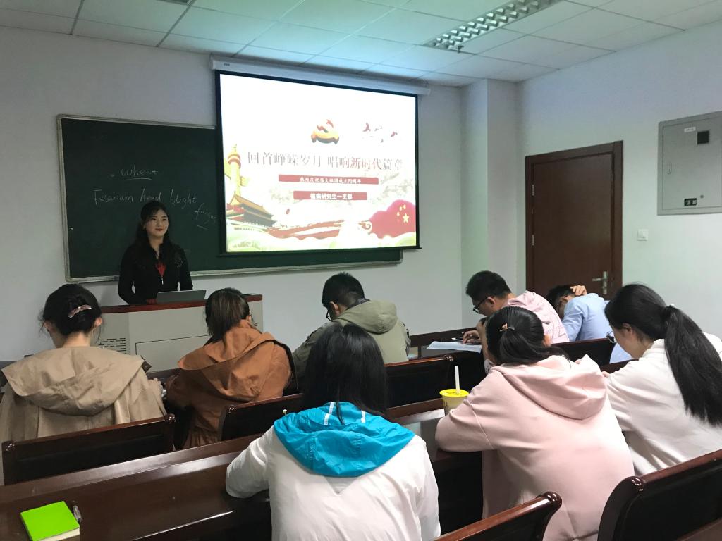 新中国成立70周年之际,我院植物病理学系研究生第一党支部召开“回首峥嵘岁月,唱响新时代篇章”专题学习活动。支部书记王燕老师担任主持人,党小组组长任元同志汇报学习内容,全体成员共同参与。