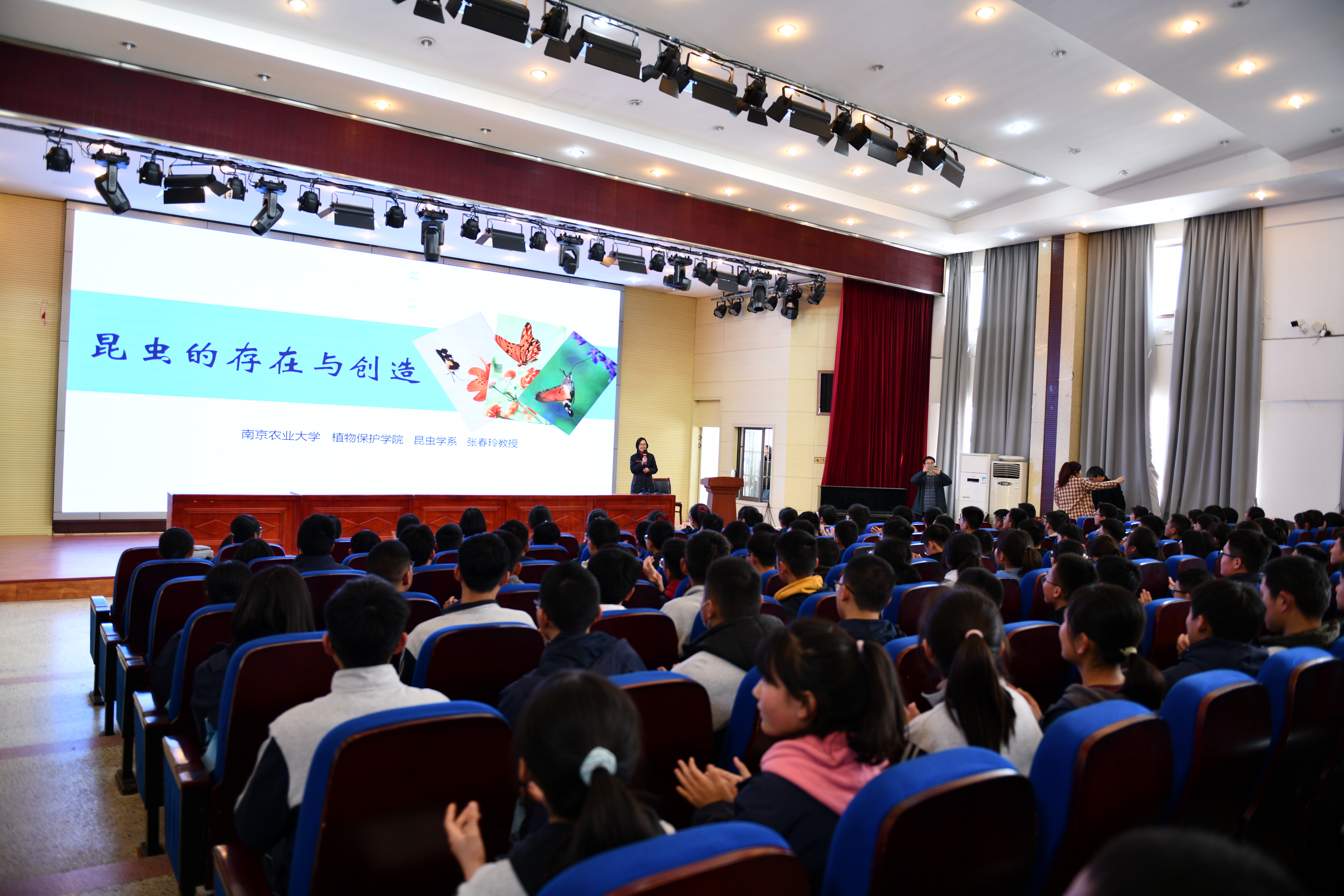 张春玲为赣中、海中共计700余名学生作了题为《昆虫的存在与创造》的科普知识讲座。从身边的昆虫说起,带领同学们走进神奇的昆虫世界,深入浅出、生动有趣的报告,以及现场展示的精美蝴蝶文创作品,赢得了在场学生积极互动、阵阵掌声、声声赞叹。