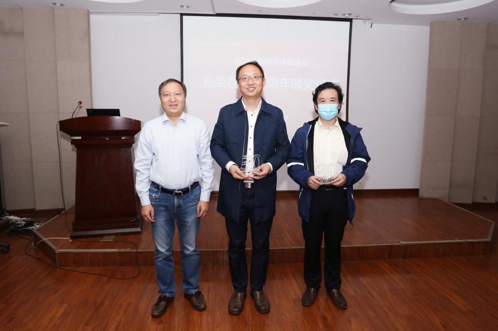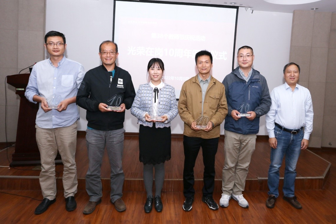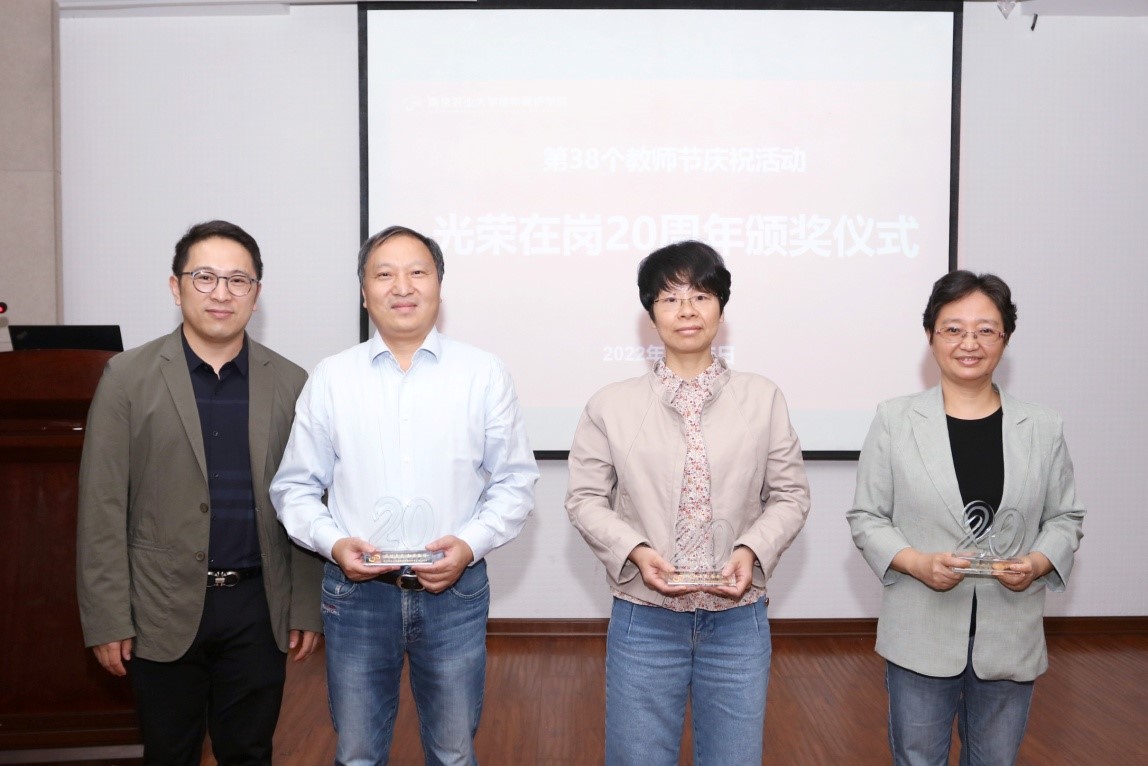 学院院长张正光为光荣在岗10周年的赵弘巍、王利民、牛冬冬、孙荆涛、张岩等五位老师,在岗30周年的王备新、樊多琦两位老师以及光荣在岗40周年的周明国、王建新两位老师颁发纪念奖杯。学院党委书记邵刚为光荣在岗20周年的张正光、王秋霞、唐玲三位老师颁发纪念奖杯。周明国、樊多琦、王秋霞、牛冬冬分别作为代表分享感悟。