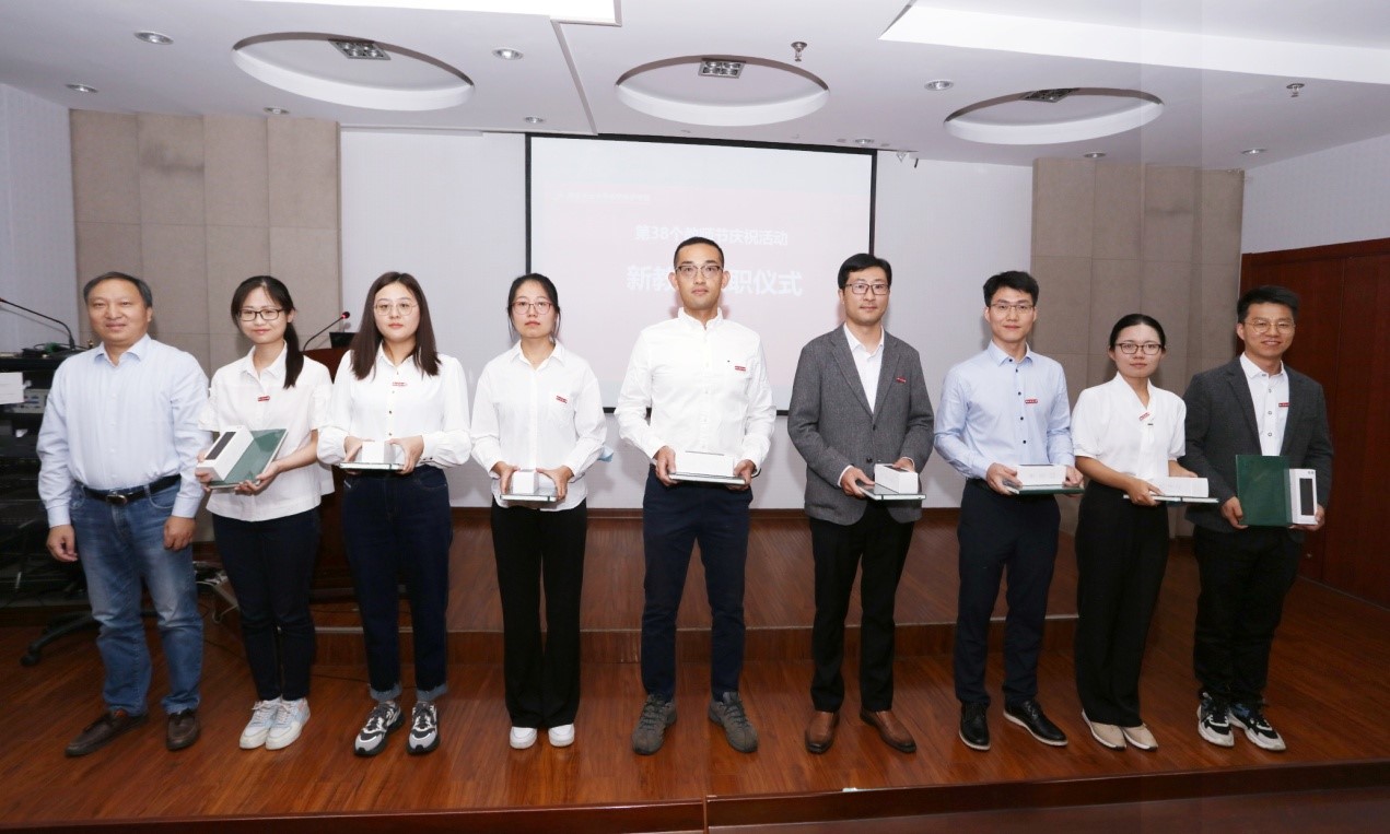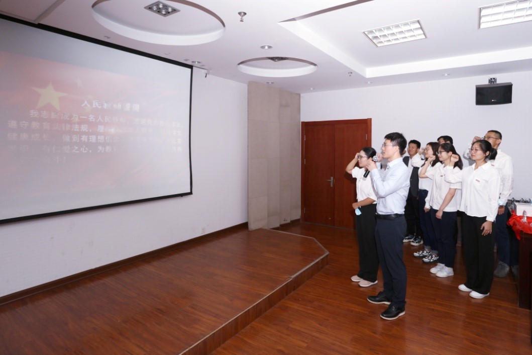 近一年新入职的10位青年教师邵小龙、李刚、何亚洲、陈金奕、张进、高云昊、杨雷云、唐莉栋、吴淑鸿、艾干依次作自我介绍,荣休教师代表郑小波、韩召军、翟保平、张春玲老师分别为新教师佩戴校徽。新教师进行了入职宣誓仪式,他们紧握右拳,庄严许下一名人民教师的神圣承诺!