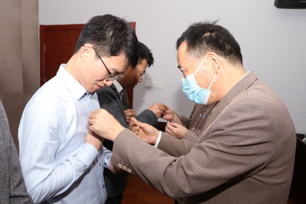 荣休教师代表为新入职教师佩戴校徽