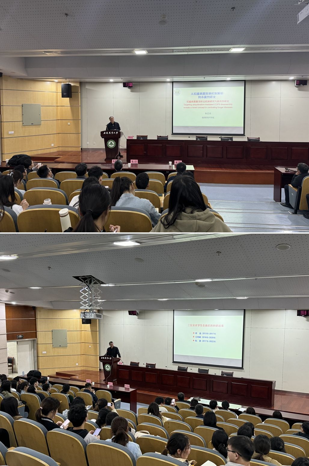 在学术交流报告会现场,我院张正光院长、陶小荣教授分别受邀作学术报告,安农植保院教师、研究生及本科生代表聆听了报告,现场反响热烈。