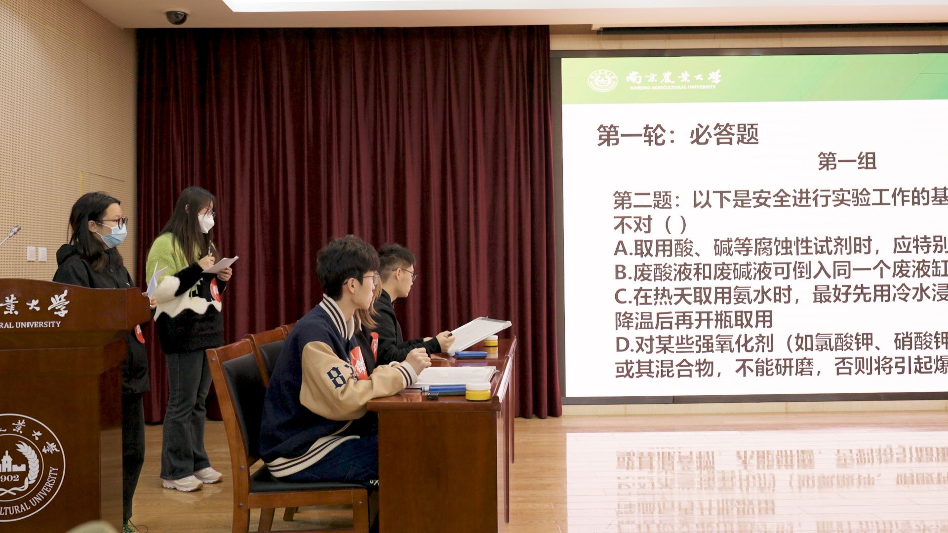 比赛的第一阶段为必答和抢答环节,11支学院代表队分三组上台回答问题。各环节均为10题, 必答环节答对1题加10分,答错不扣分,抢答环节答对1题加20,答错扣10分。如若分数相同,则进行一题定胜负,选手紧张的抢答及观众的热情互动把比赛现场氛围一点点推向高潮,最终,经过激烈角逐,农学院、工学院,食品学院、动科学院、资环学院、园艺学院进入下一阶段比赛。