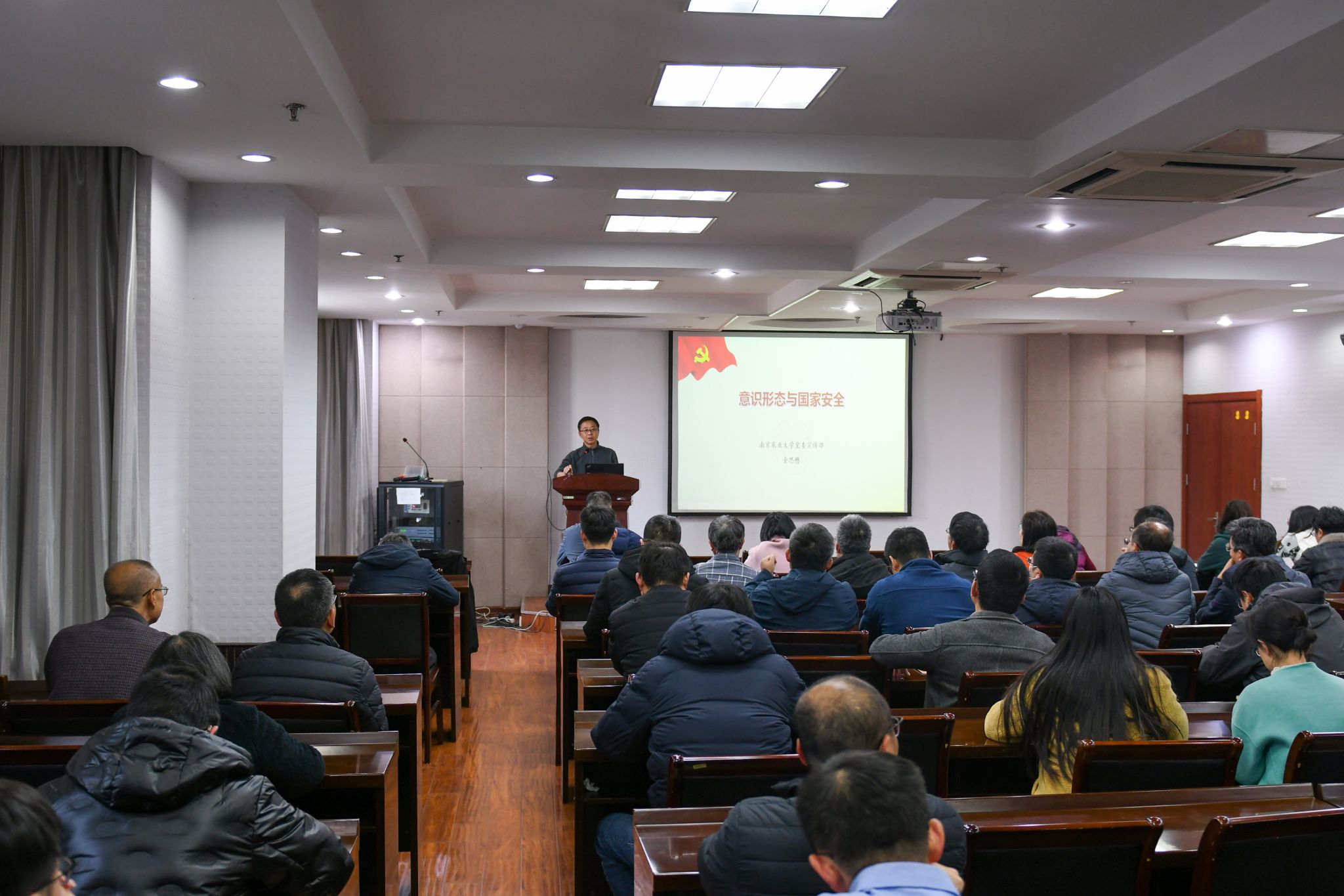 会上,全思懋以《意识形态与国家安全》为题,首先向老师们强调了意识形态工作是党的一项极端重要的工作,是为国家立心、为民族立魂的工作。随后他从什么是意识形态、意识形态斗争的主要形式、当前我国意识形态工作面临的形势、当前意识形态领域存在的挑战、如何做好意识形态工作等五个方面,详细分析了当前意识形态领域面临的新情况、新问题、新风险、新挑战,深入浅出地讲解了筑牢意识形态安全防线,守牢意识形态阵地。