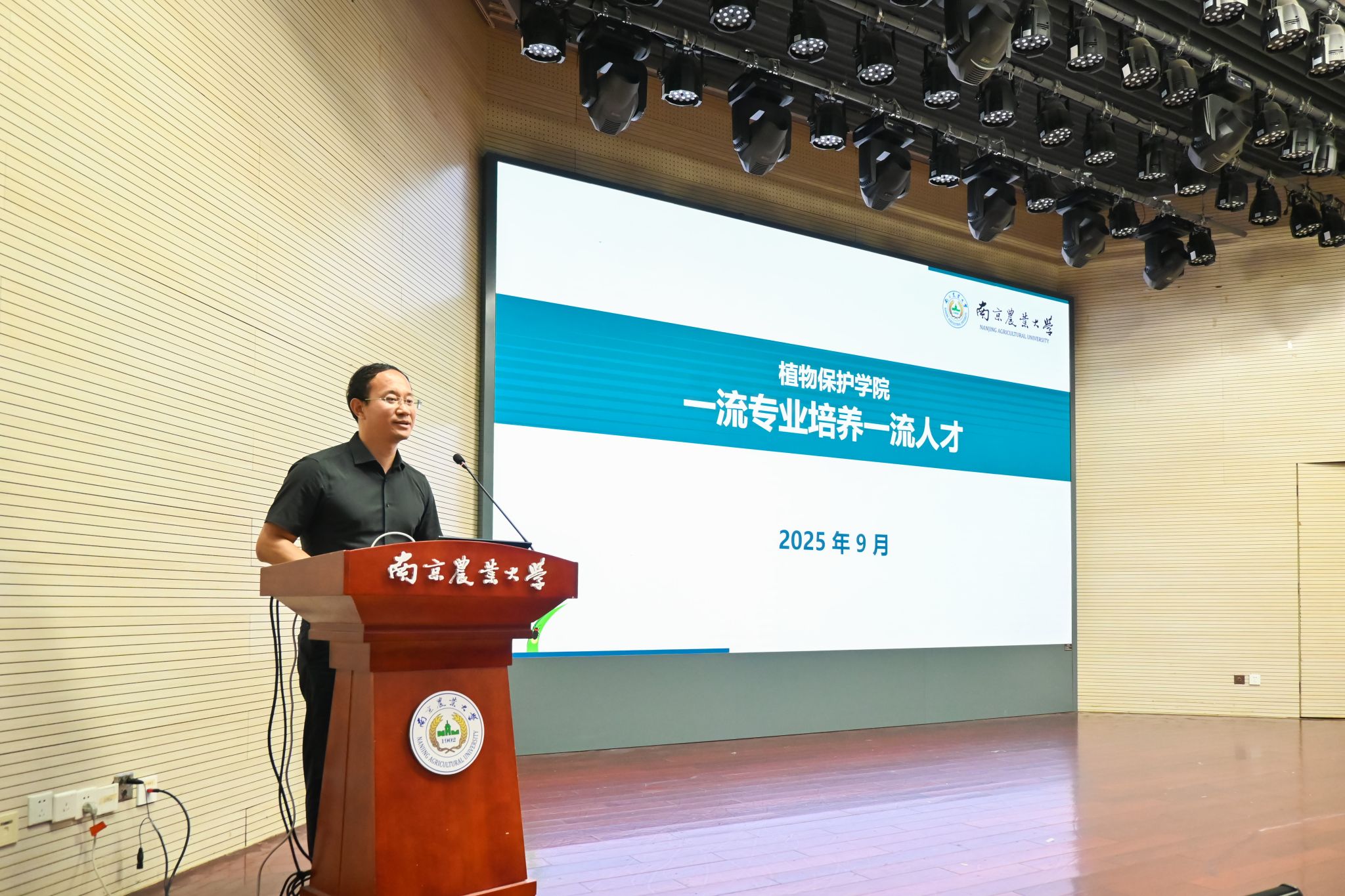 2025级本科生开学典礼上发表讲话,向新生表示欢迎,他提到,植物保护专业事关国家粮食安全、生态安全和农产品质量安全,并指出南农植保学科底蕴深厚、师资一流。他对新生提出三点期望:一要勤学求真,夯实专业基础,做到知行合一;二要修身立德,锤炼综合素养,培养独立思考与团队协作能力;三要志存高远,将个人理想融入乡村振兴和农业强国建设,勇担强农兴农时代使命。学院将全力支持学生成长,希望新生在南农植保学有所成、不负韶华。