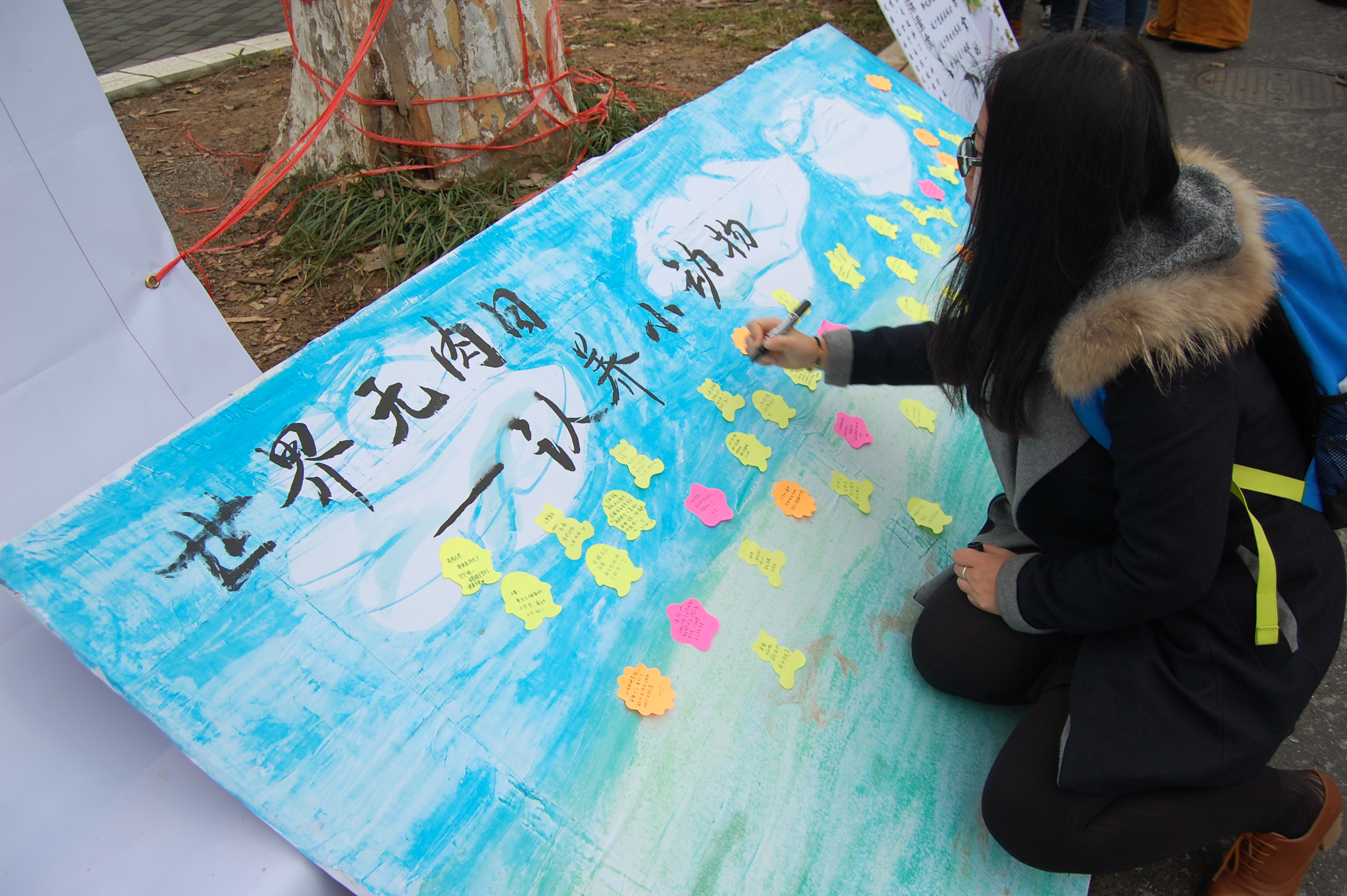 在几个小时的努力下,宣传板上贴满了各色各样的便利贴,“世界无肉日之认养小动物”的活动圆满结束。对此,实践部所有成员表示这次活动虽小,但意义非凡,他们希望人们能携手保护动物,减少杀戮,让动物成为人类亲密的朋友,人类成为动物信赖的伙伴。