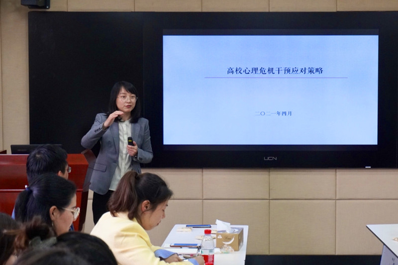 “朋辈课堂”环节邀请到生命科学学院党委副书记李阿特做《高校心理危机干预应对策略》的主题分享。她从自身的工作经历、感受体会谈起,辅以生动的人物案例,分享了识别心理问题、应对心理危机、做好家校沟通协调等问题的实战技巧和心得体会。主题分享干货满满,辅导员们受益匪浅。