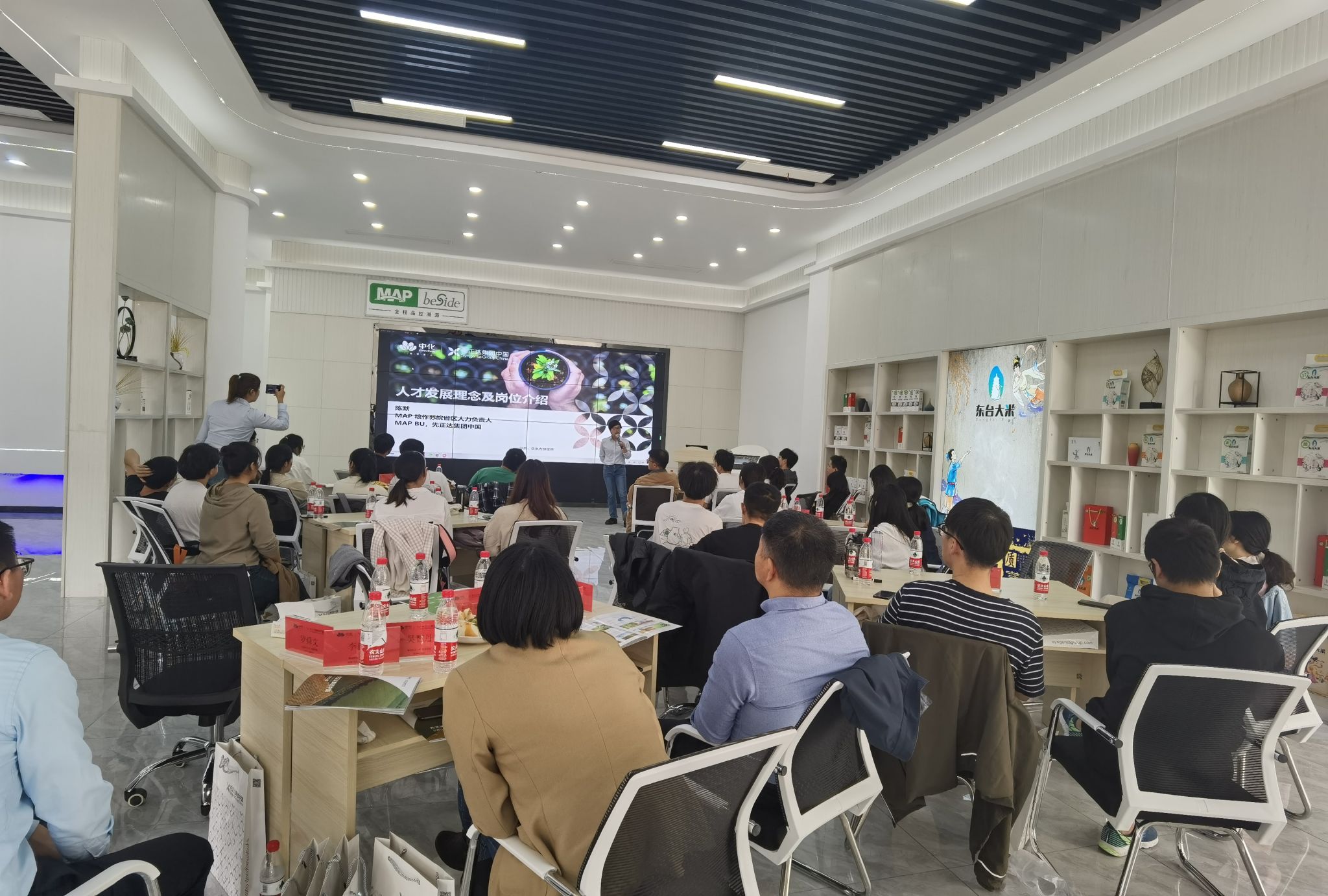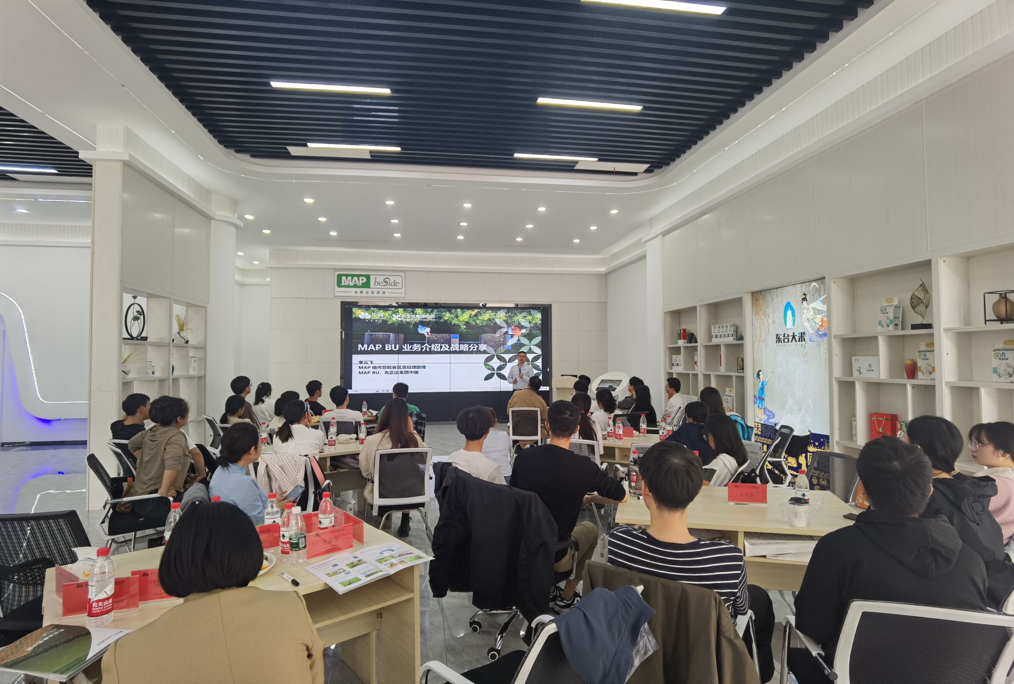 在校企交流环节,MAP与数字农业人力资源部副总监游会静宏观介绍MAP与数字农业的使命、愿景、核心理念及业务模块,鼓励青年学生学农为农、为中国农业现代化贡献智慧和力量。MAP粮作苏皖省区总经理助理李云飞详细介绍MAP BU业务及战略,MAP粮作苏皖省区人力负责人陈默具体介绍公司岗位及人才发展理念。同学们也就校招等问题与公司负责人交流。