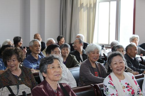 学术报告厅济济一堂,在校庆110周年前夕,植保62届校友六十多人欢聚母校喜迎校庆,共叙毕业五十年来的友情。