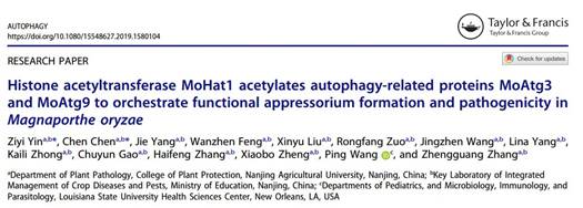 关于组蛋白乙酰转移酶介导细胞自噬控制稻瘟病菌的功能性附着胞形成和致病力的研究论文“Histone acetyltransferase MoHat1 acetylates autophagy-related proteins MoAtg3 and MoAtg9 to orchestrate functional appressorium formation and pathogenicity in Magnaporthe oryzae”。该论文第一署名单位为麻豆av