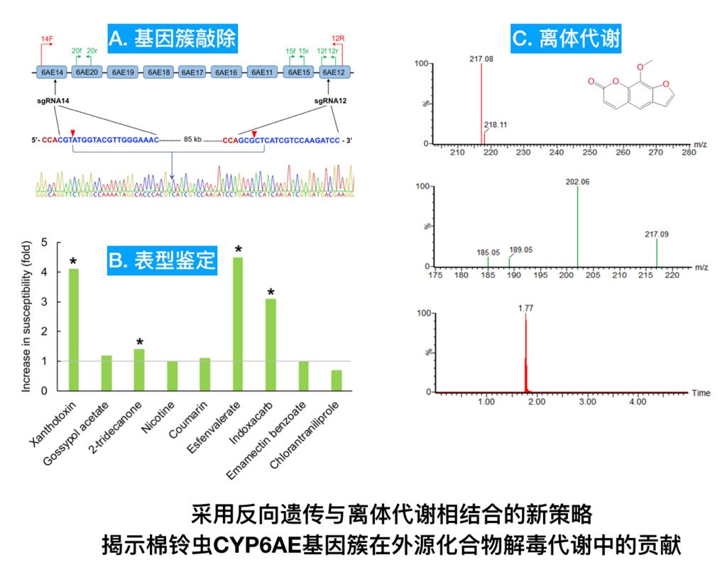 棉铃虫CYP6AE基因簇包含9个首尾相连的P450基因,已有一些报道推测该基因簇中的部分P450基因与外源化合物代谢相关。本研究采用CRISPR/Cas9基因编辑技术敲除了长达85kb的棉铃虫CYP6AE基因簇,发现基因簇敲除品系对两种植物次生性化合物(花椒毒素和2-十三烷酮)以及两种杀虫剂(顺式氰戊菊酯和茚虫威)的敏感性显著提高,预示该P450基因簇中的一个或多个基因参与了这些外源化合物的解毒代谢。然后,对CYP6AE基因簇中9个P450基因逐一进行离体表达,并分别检测对上述4种外源化合物的代谢活性,从而锁定该基因簇中参与解毒代谢的5个P450基因。