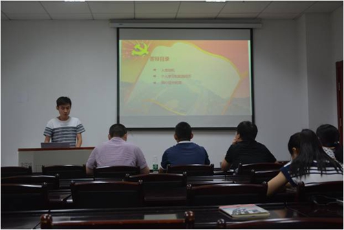 研究生发展对象与预备党员转正答辩会在理科楼B402举行.各支部推荐的党的发展对象参加答辩,学院党委副书记黄绍华,研究生支部书记王利民、顾沁老师和研究生辅导员吴智丹老师出席会议。